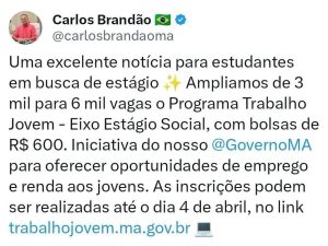 O governador Carlos Brandão anunciou 6 mil vagas de estágios remunerados O governador Carlos Brandão postou que as inscrições estão abertas, veja o que