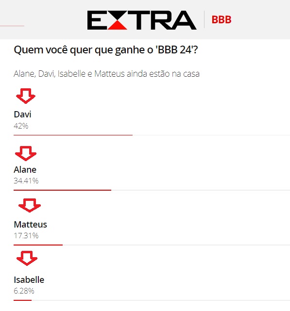 O “Big Brother Brasil 24” já tem seu top 4. Com a eliminação de Bia, restam no jogo Alane, Davi, Isabelle e Matteus, os amigos do grupo fadas. Quem é seu favorito para ganhar o programa? O Site Extra aponta, por meio de sua Enquete, com Milhões de participantes, que Daví será o campeão desta edição!