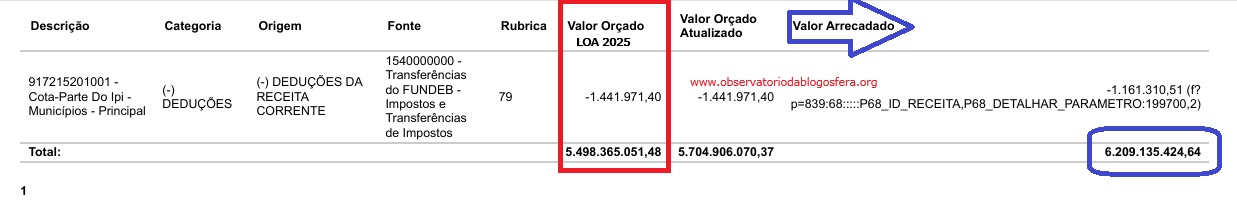 Uma estimativa realizada pelo Site Observatório aponta que até o final do Exercício Fiscal deste ano, em 31/12/2025 e do período de CONSOLIDADAÇÃO DA ARRECADAÇÃO, a agestão Braide deve fechar o Relatório Orçamentário, em cerca de R$ 6 BILHÕES E 500 MILHÕES, ou seja, mais de R$ 1 BILHÃO de superávit orçamentário. Veja abaixo, o quadro atual com a arrecadação provisória.