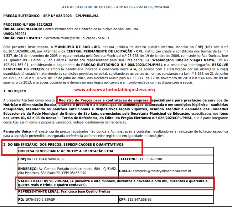 Atenção Polícia Federal! Gestão Braide registra “Ata de Preços” da RC NUTRY por R$ 100 MILHÕES