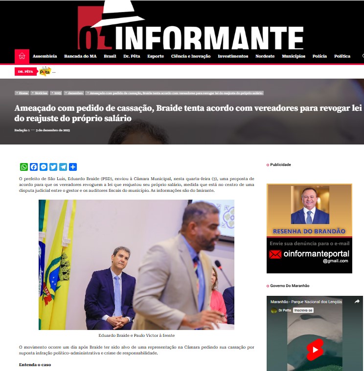 A denúncia do servidor aposentado Carlos Alberto Machado acusa o prefeito de descumprir leis municipais vigentes, principalmente a Lei nº 7.729/2025, que é a que reajustou o salário de Braide e define o teto remuneratório municipal. Segundo a representação, o prefeito não aplica a norma, ao mesmo tempo em que teria promovido cortes considerados ilegais nos salários de servidores, aposentados e pensionistas desde novembro de 2024.
