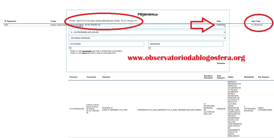 SÃO LUÍS – Um convênio no valor de R$ 14.139.040,00 (Quatorze Milhões, Cento e Trinta e Nove Mil Reais), firmado entre a Prefeitura de São Luís, comandada pelo prefeito Eduardo Salim Braide (PSD), e o Instituto Cultural Nossa Senhora de Fátima, está no centro de uma investigação sobre possíveis irregularidades em contratos públicos. Os recursos, seriam destinados à execução da programação do aniversário de 413 anos da cidade, celebrados neste mês de setembro, foram contratados via dispensa de licitação, sob a justificativa de “OUTROS/NÃO APLICÁVEL”.