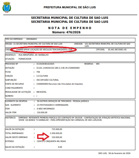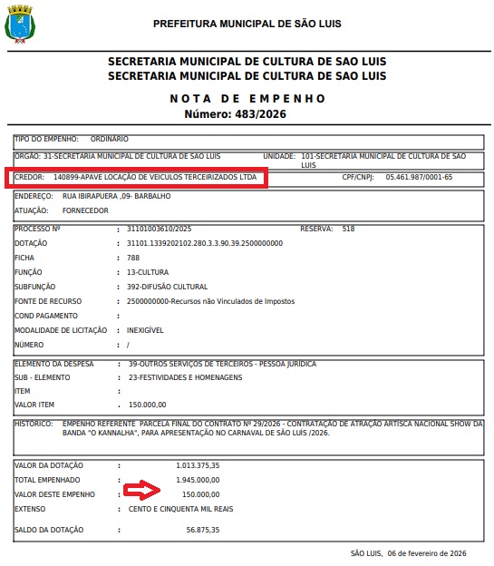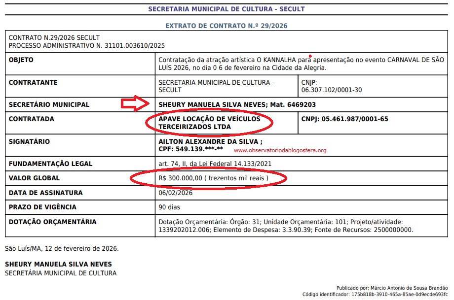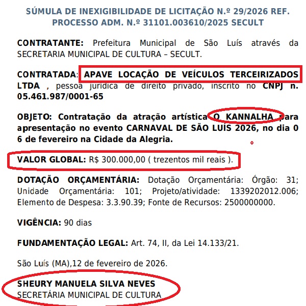 Recém chegada na Secretaria Municipal de Cultura de São Luís – SECULT, Sheury Manuela Silva Neves pagou R$ 300.000,00 (Trezentos Mil Reais), a uma locadora de veículos, a APAVE – LOCAÇÃO DE VEÍCULOS TERCEIRIZADOS LTDA, para que o artista O KANALHA se apresentasse no Carnaval de São Luís, na “Cidade da Alegria”. Veja abaixo, o Contrato e o Documento que liberou a INEXIGÊNCIA DE LICITAÇÃO.