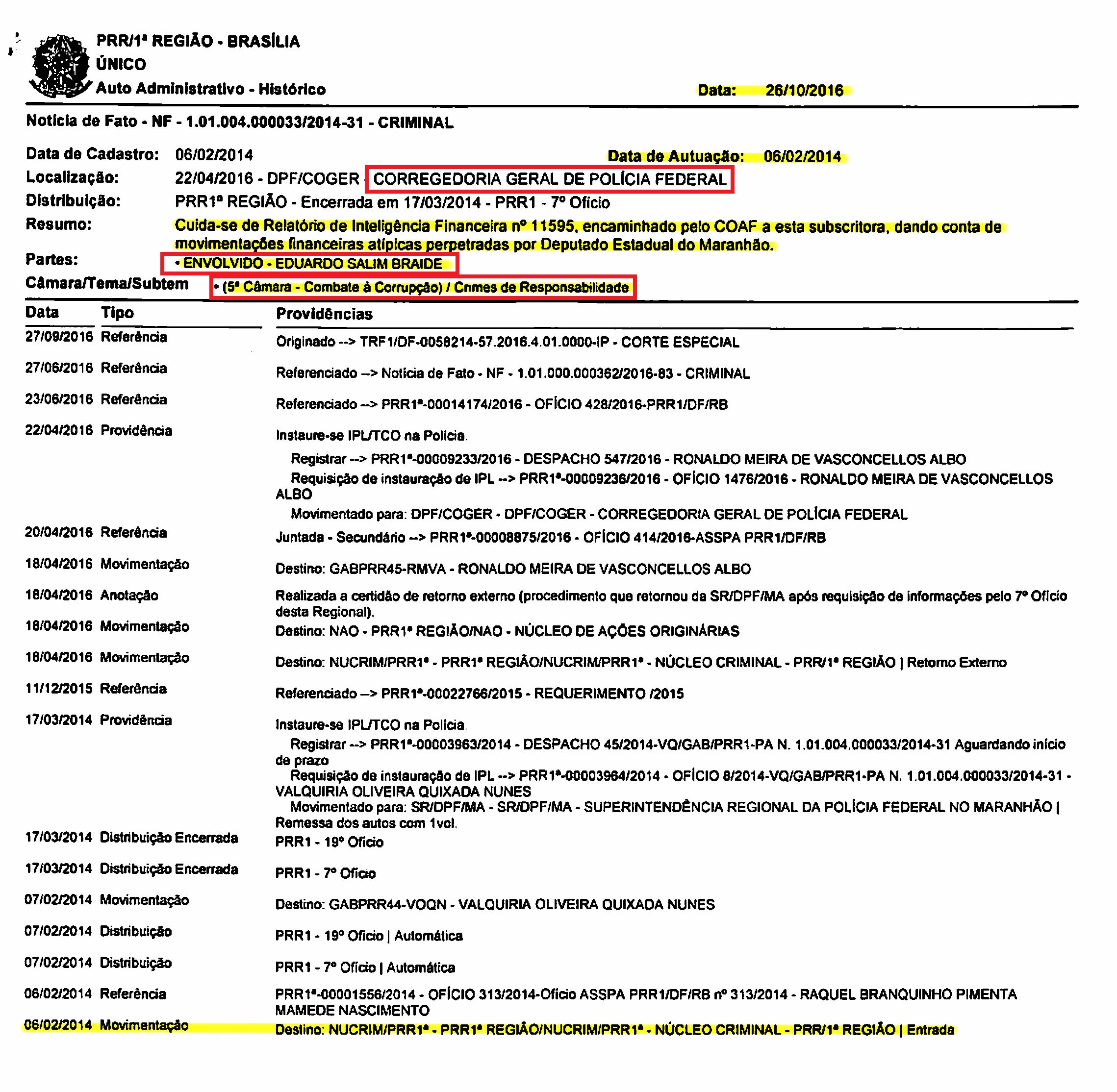 De acordo com a documentação, o processo foi aberto desde o dia 2 de fevereiro daquele ano, após o Relatório de Inteligência Financeira n.º 11595, encaminhado pelo CONSELHO DE CONTROLE DE ATIVIDADES – COAF, após apontar as movimentações financeiras atípicas perpetradas por Eduardo Braide. O caso criminoso parou na 5ª Câmara do Tribunal Regional Federal (TRF) 1ª Região, no Distrito Federal, em Brasília, responsável por casos de combate à corrupção e crimes de responsabilidade. VEJA ABAIXO, O RELATÓRIO DO COAF!