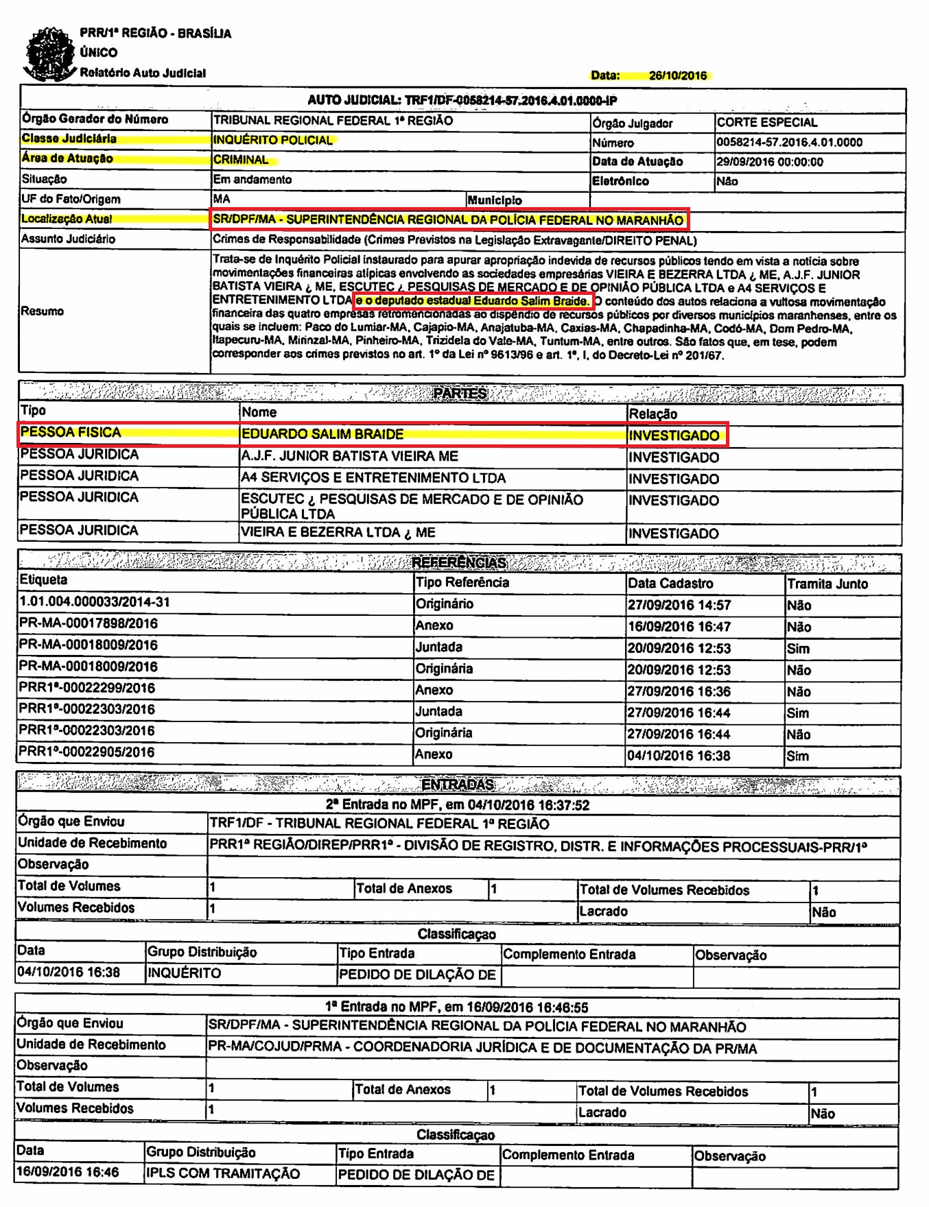 Em fevereiro daquele ano de 2014, o então deputado estadual Eduardo Braide era investigado pela Polícia Federal por apropriação indevida de recursos públicos e lavagem de dinheiro. A investigação estava por sob sigilo a pedido da defesa do próprio Braide, e faziam parte do Inquérito Policial instaurado pela PF para apurar vultuosas movimentações financeiras atípicas feitas por Eduardo Braide; o instituto Escutec – Pesquisas de Mercado e Opinião Ltda, pertencente ao empresário Fernando Júnior; e as empresas de fachada A4 Serviços e Entretenimento, A. J. F. Júnior Batista Vieira – ME e Vieira e Bezerra – ME (atual F. C. B. Produções e Eventos), operadas pelo próprio Fernando Júnior em conluio com o pai e o ex-assessor-fantasma, respectivamente, Carlos Braide e Fabiano Bezerra, por meio do dispêndio de recursos públicos em diversas prefeituras no Maranhão. Este caso foi parar no Fantástico, que envolvia o prefeito de Anajatuba, Élder Aragão. Veja abaixo!