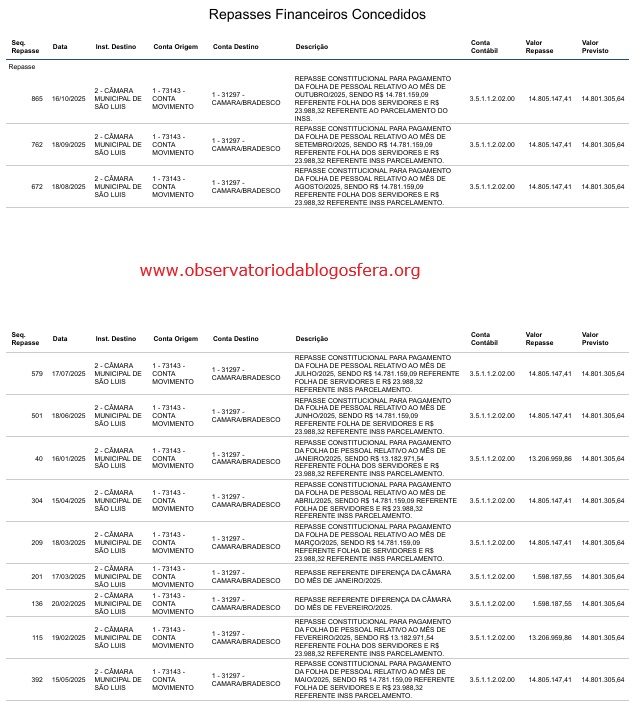 A Câmara Municipal de São Luís já recebeu em apenas dez meses, um total de R$ 148.051.474,10 (Cento e Quarenta e Oito Milhões, Cinquenta e Um Mil, Quatrocentos e Setenta e Quatro Reais e Dez Centavos), em repasses da Prefeitura Municipal de São Luís. Este repasse é referente ao pagamento da Folha Salarial de Pessoal, entre os meses de Janeiro e Outubro deste ano de 2025. Veja abaixo os extratos!