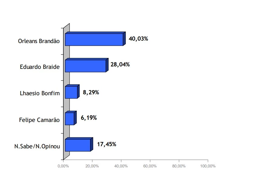 Simulando um cenário em que não esteja na disputa Eduardo Braide, os números são esses: Orleans Brandão com 44,08% sendo seguido por Lahésio Bomfim com 17,15% e Felipe Camarão com 11,73%.