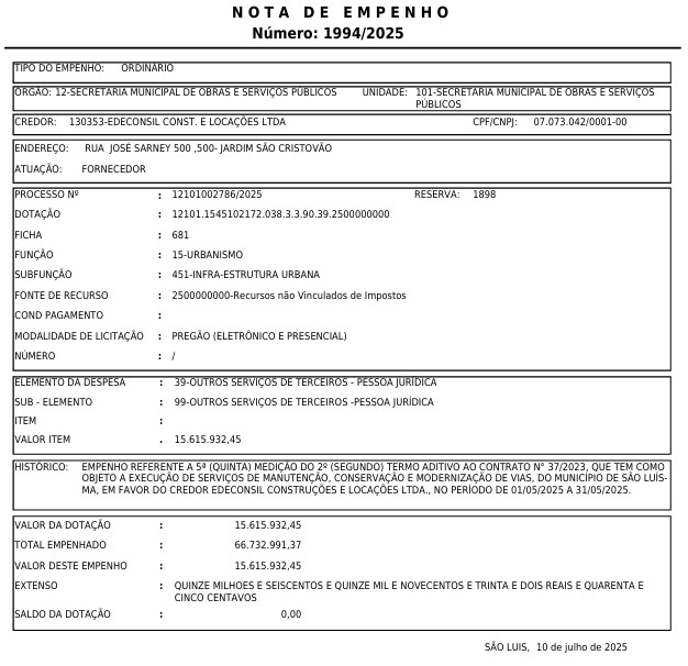 O Site Obsercvatório faz uma investigação na qual aponta que no último dia 10 deste mês de julho, a gestão Braide empenhou R$ 15.615.932,45 (Quinze Milhões, Seiscentos e Quinze Mil, Novecentos e Trinta e Dois Reais), para a Edeconsil Construções e Locações Ltda – 07.073.042/0001-00, sempre com a mesma justificativa de contratos aditivos para a execução de serviços de manutenção, conservação e modernização de vias do município de São Luis. Reveja abaixo!