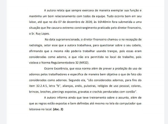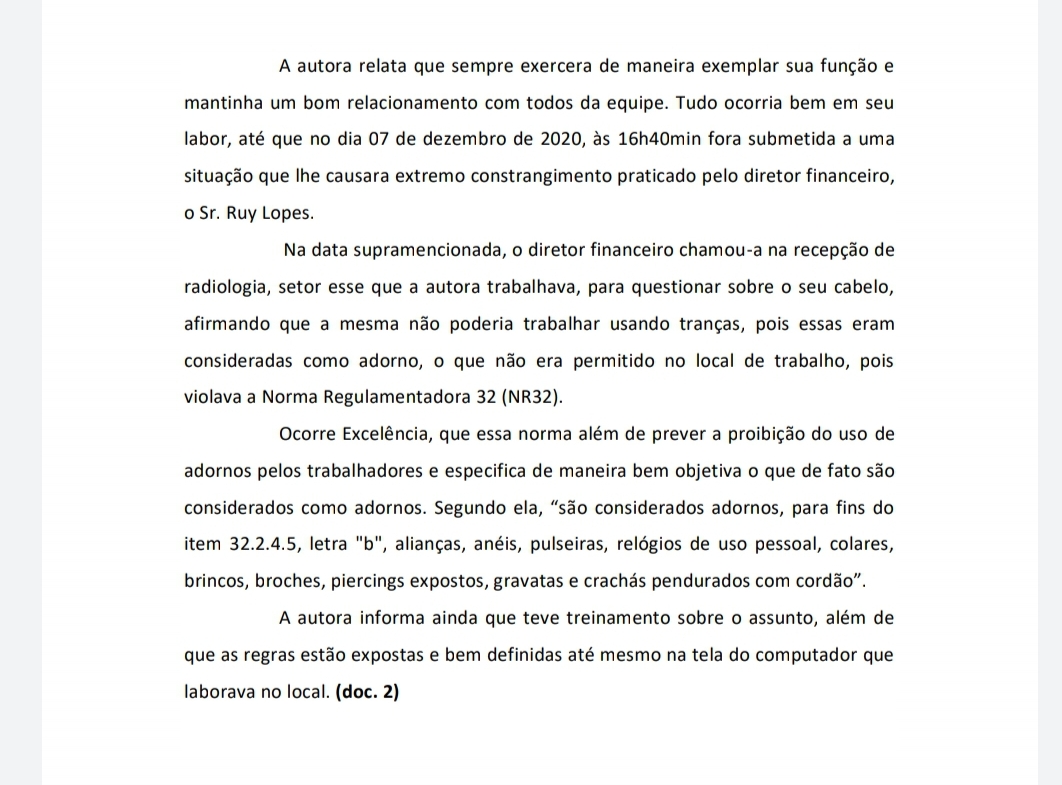 A ex-funcionária questionou porque as outras colegas não estavam usando touca já que estavam de cabelos soltos, ele veementemente afirmou que cabelo liso podia e trança afro seria adorno e que a funcionária não podia questionar pois ele era diretor do hospital.