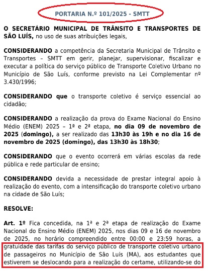 A situação de fazer politicagem com o dinheiro do contribuinte, efetuando gratuidades sem ao menos cumprir com o acordo coletivo vigente, evidencia uma desorganição ampla e total da gestão Braide para com o Sistema de Transporte Público Coletivo Urbano de São Luís. A mais nova “arte” do prefeito Braide, foi anunciar o Passe Livre, aos estudantes que farão o Exame Nacional do Ensino Médio – ENEM, no próximo domingo (16), sem ao menos saber o que está se passando no Sistema de Transporte da Capital. A ação beira o amadorismo, falta de profissionalismo, mesmo. Veja abaixo, a Portaria da SMTT, na qual libera o Passe Livre aos estudantes que farão o ENEM.