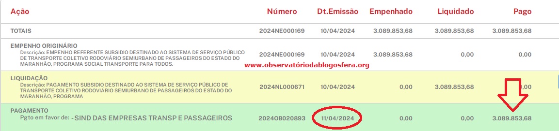O Site Observatório publica com Exclusividade, o extrato do primeiro e último pagamento do subsídio, no valor de R$ 3.089.853,68 (Três Milhões e Oitenta e Nove Mil Reais), feito pela MOB. Veja abaixo!