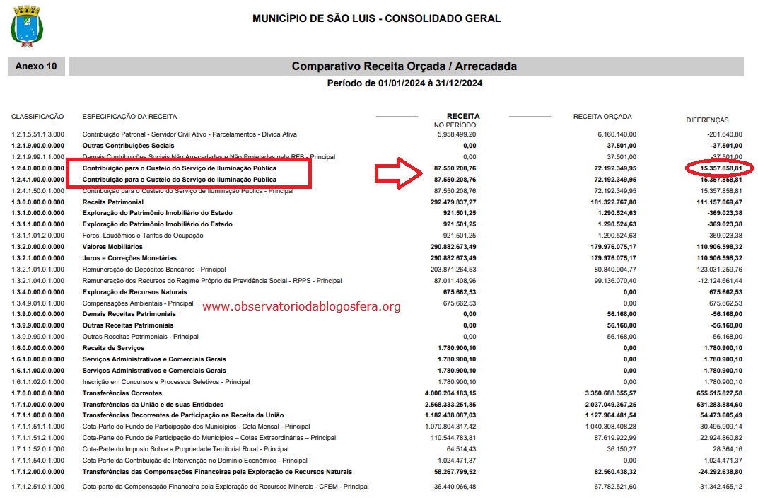 Apenas com a Taxa de Iluminação Pública, a gestão do prefeito Eduardo Braide (PSD), arrecadou R$ 15 Milhões a mais em 2024, um total de R$ 87.550.208,76 (Oitenta e Sete Milhões de Reais), quando era previsto arrecadar R$ 72.192.349,45 (Setenta e Dois Milhões de Reais)