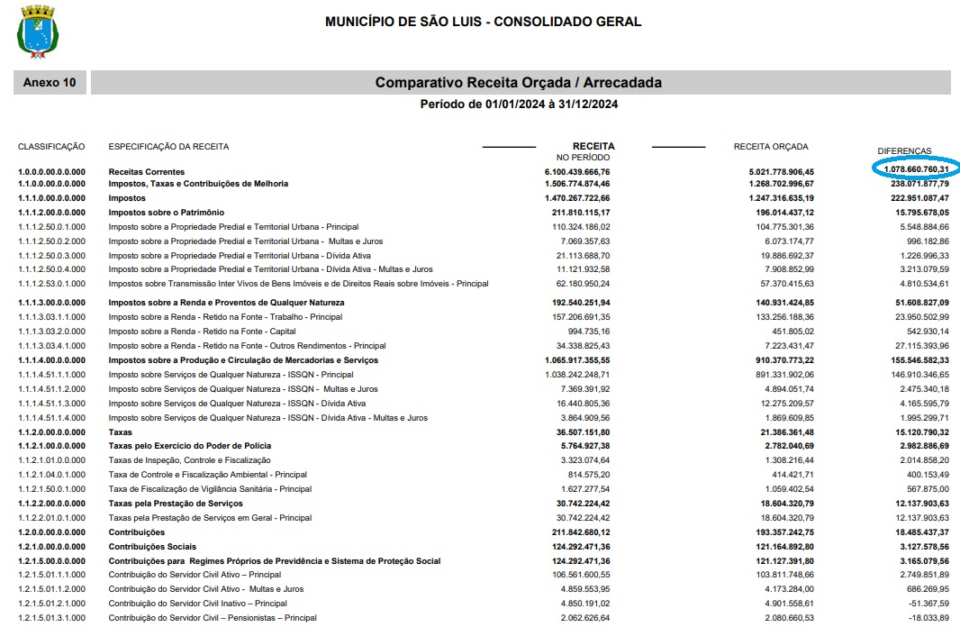 Para este ano de 2025, a Prefeitura de São Luís, ainda não contabilizou a estimativa do fechamento do Exercício Fiscal, mas os números apontam para um novo excesso de arrecadação, a Lei Orçamentária 2025, fixou o Orçamento para este ano, no valor de R$ 5.498.365.051,48 (Cinco Bilhões, Quatrocentos e Noventa e Oito Milhões de Reais), mas a gestão Braide já arrecadou R$ 5.766.332.264,61 (Cinco Bilhões, Setecentos e Sessenta e Seis Milhões de Reais), quase R$ 300 Milhões de Reais a mais que o previsto.