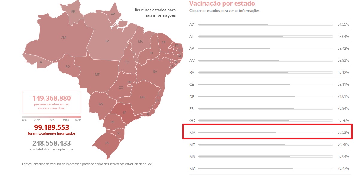 O Maranhão é dentre os 27 estados da federação que menos aplicou vacinas, com apenas 57,53% da população completamente imunizada. São Paulo é o estado que mais aplicou as duas doses da vacina e tem 80% de sua população imunizada.