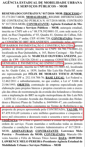 Contrato assinado no Governo Flávio Dino, no dia 20 de setembro de 2018, previa a conclusão das obras do BRT, em 48 meses, a um custo de R$ 87.459.816,69 (Oitenta e Sete Milhões Quatrocentos e Cinquenta e Nove Mil Oitocentos e Dezesseis Reais e Sessenta e Nove Centavos)