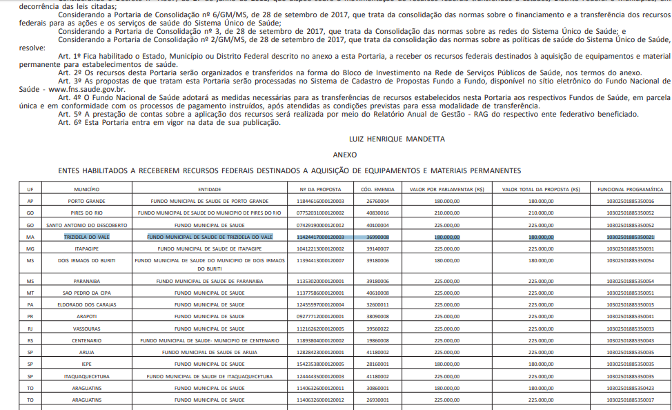 Trizidela do Vale receberá 180 mil para aquisição de equipamentos de saúde
