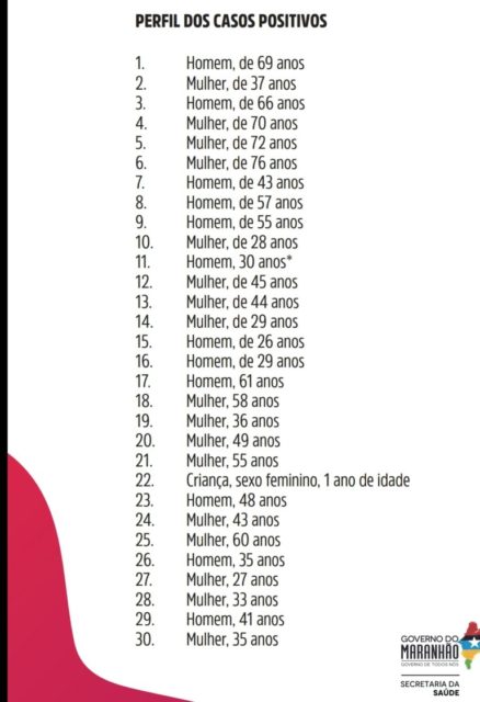 Maranhão : Entre os 31 testados positivo para covid 19, 7 idosos, 17 mulheres e uma criança