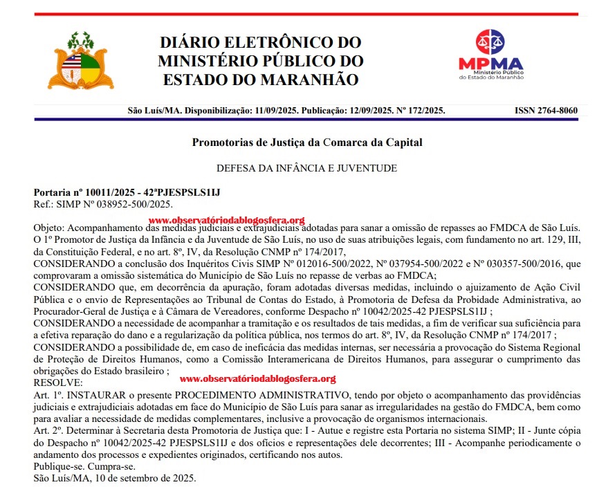 Ministério Público pediu auditoria na Prefeitura de São Luís por falta de repasses de cerca de R$ 68 Milhões ao FMDCA; e não descarta provocar