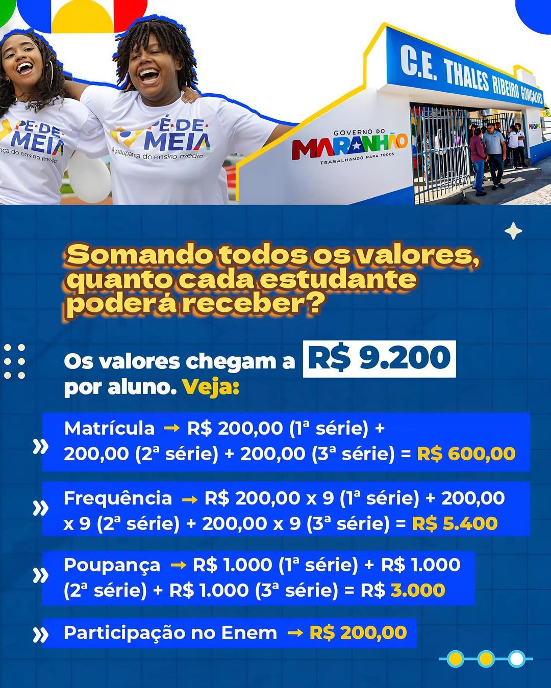 Haverá, ainda, um pagamento de R$ 200,00 (Duzentos Reais) exclusivo para os alunos do 3º ano do Ensino Médio para participação no ENEM. O valor só poderá ser sacado com a conclusão do Ensino Médio.