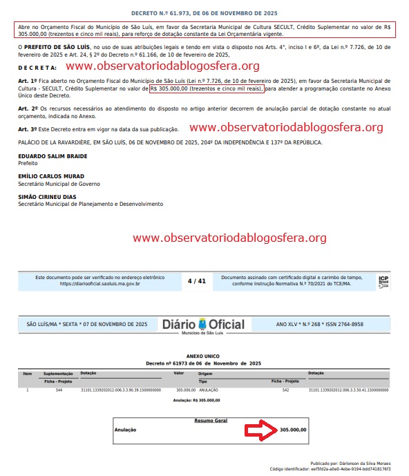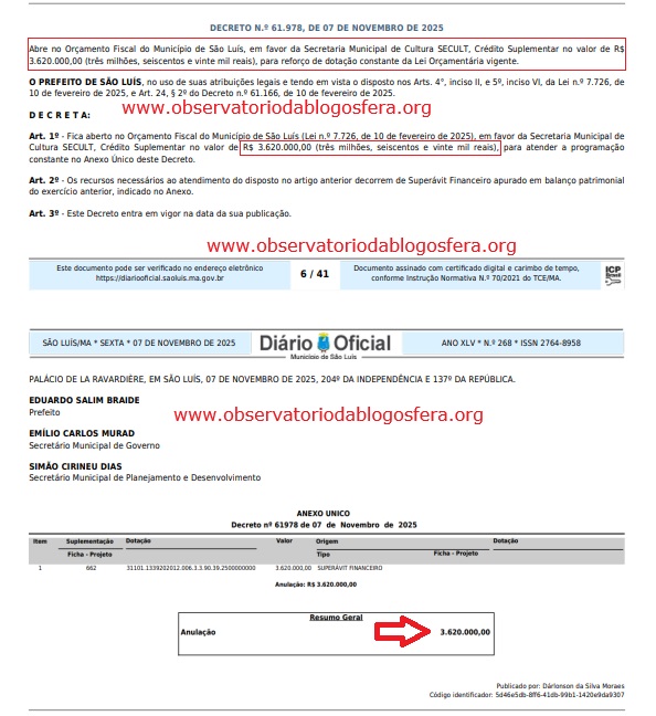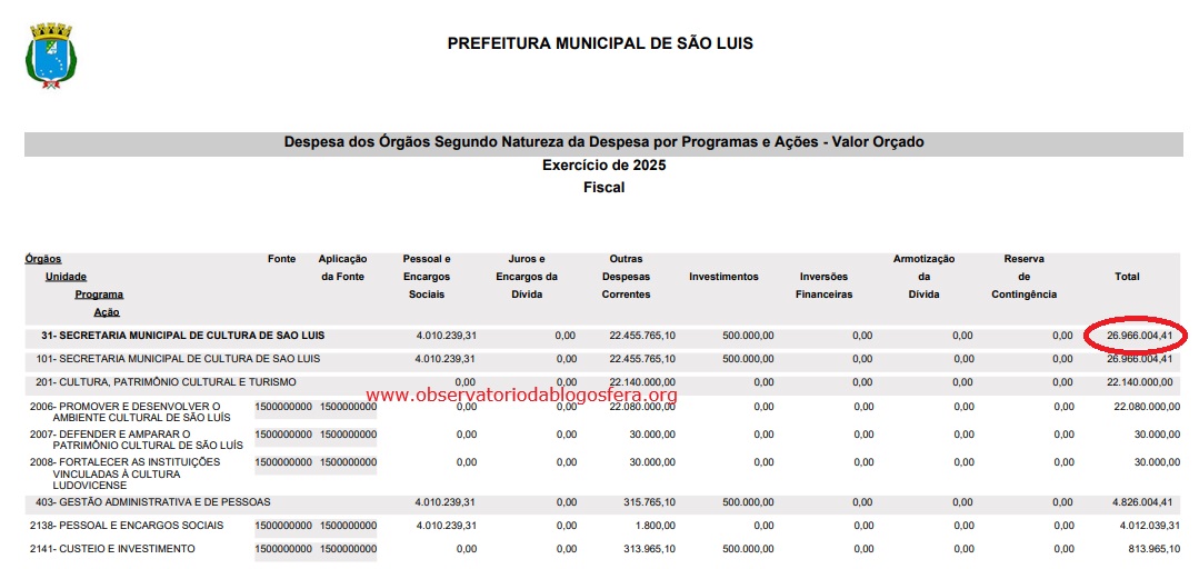 A Prefeitura de São Luís, sob a gestão do prefeito Eduardo Salim Braide (PSD), já realizou uma série  descomunal de suplementações no orçamento da Secretaria Municipal de Cultura – SECULT, entre os meses de janeiro a novembro de 2025. Com um orçamento aprovado na Lei Orçamentária Anual – LOA 2025, de R$ 26.966.004,41 (Vinte e Seis Milhões, Novecentos e Sessenta e Seis Mil, Quatro Reais e Quarenta e Um Centavos), a Pasta já gastou R$ 91.728.887,50 (Noventa e Um Milhões, Setecentos e Vinte e Oito Mil, Oitocentos e Oitenta e Sete Reais), e se contar com o empenhado para pagar, os gastos chegarão a R$ 110 Milhões neste ano, o que aponta para um remanejamento de mais de 300% (Trezentos por cento), no orçamento aprovado em LOA.