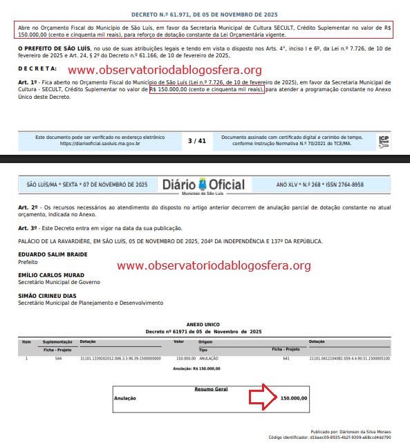 Apenas na última sexta-feira (7), de novembro, o prefeito Eduardo Braide remanejou mais R$ 4.075.000,00 (Quatro Milhões, Setenta e Cinco Mil Reais),  para a pasta da Cultura, como mostram os extratos abaixo!