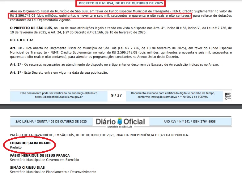 Logo no 1º dia deste mês de outubro, o prefeito Eduardo Braide (PSD) assinou o decreto 61.854, abrindo no Orçamento Fiscal de São Luís, a bagatela de R$ 2.596.748,08 (Dois Milhões, Quinhentos e Noventa e Seis Mil, Setecentos e Quarenta e Oito Reais e Oito Centavos), em favor do Fundo Especial Municipal de Transportes Urbanos – FEMT.