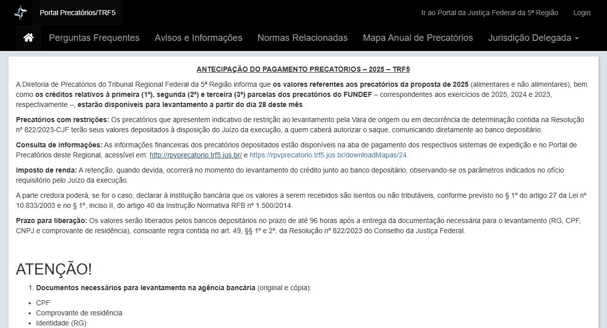 A Diretoria de Precatórios do Tribunal Regional Federal da 5ª Região acabou de informar que os valores referentes aos precatórios REFERENTE A 2025, bem como os créditos relativos à primeira (1ª), segunda (2ª) e terceira (3ª) parcelas dos precatórios do FUNDEF – correspondentes aos exercícios de 2025, 2024 e 2023, respectivamente –, estarão disponíveis para serem sacados a partir do dia 28 de julho, ou seja, na próxima segunda-feira. VEJA ABAIXO, O COMUNICADO DO TRF5